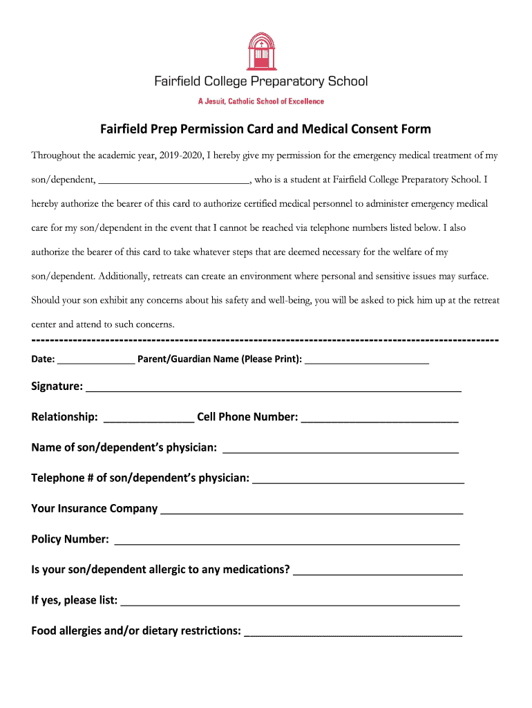 Fairfield Prep Permission Card and Medical Consent Form Throughout the academic year, 20192020, I hereby give my permission for the emergency medical treatment of my son/dependent, who is a student