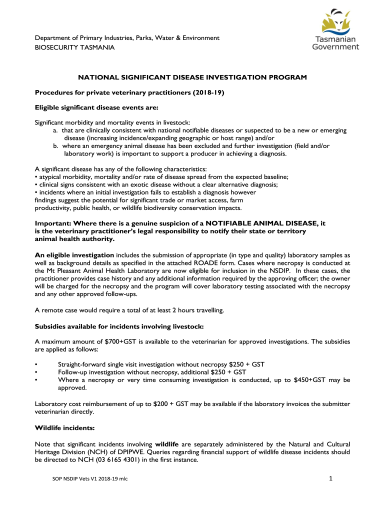 Department of Primary Industries, Parks, Water & Environment BIOSECURITY TASMANIANATIONAL SIGNIFICANT DISEASE INVESTIGATION PROGRAM Procedures for private veterinary practitioners (201819) Eligible