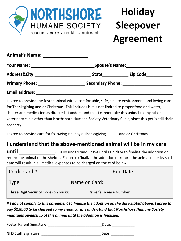 Holiday Sleepover Agreement Animals Name: Your Name: Spouses Name: Address&City: State Zip Code Primary Phone: Secondary Phone: Email address: I agree to provide the foster animal with a comfortable,