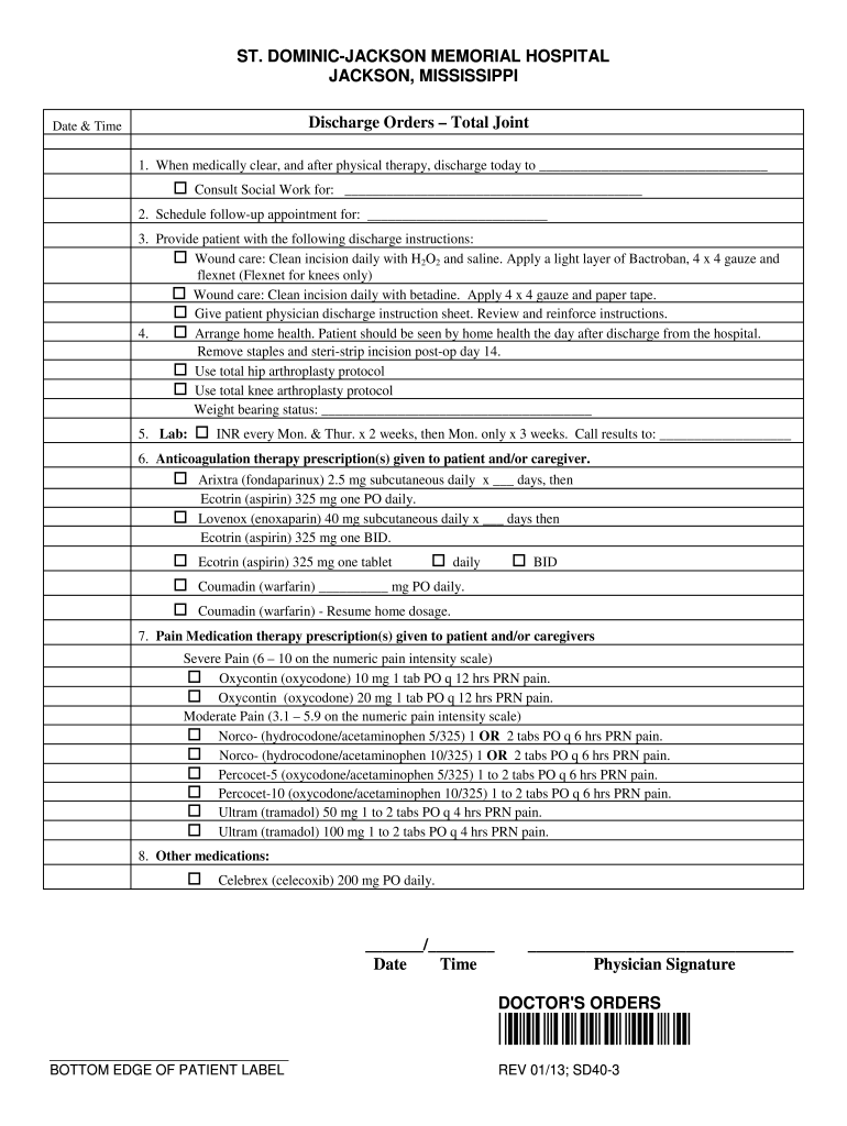 ST. DOMINICJACKSON MEMORIAL HOSPITAL JACKSON, MISSISSIPPI Discharge Orders Total Postdate & Time1. When medically clear, and after physical therapy, discharge today to Consult Social Work for: 2.