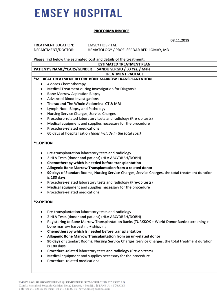 PROFORMA INVOICE 08.11.2019 TREATMENT LOCATION: DEPARTMENT/DOCTOR:EM SEY HOSPITAL HEMATOLOGY / PROF. SE RDAR BED MAY, MDP lease find below the estimated cost and details of the treatment; ESTIMATED