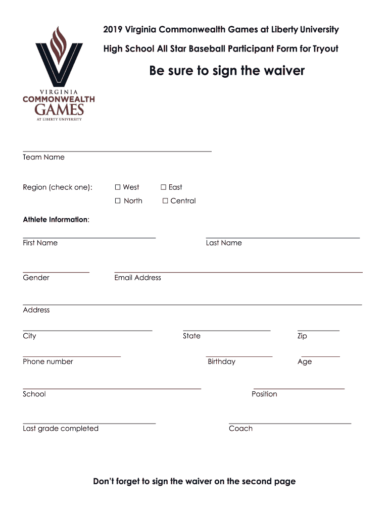 2019 Virginia Commonwealth Games at Liberty UniversityHigh School All Star Baseball Participant Form for Tryout Be sure to sign the waiverTeam Name West NorthRegion (check one): East CentralAthlete
