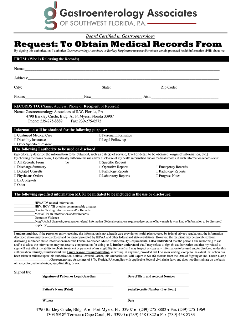 Board Certified in GastroenterologyRequest: To Obtain Medical Records From By signing this authorization, I authorize Gastroenterology Associates or Barkley Supercenter to use and/or obtain certain