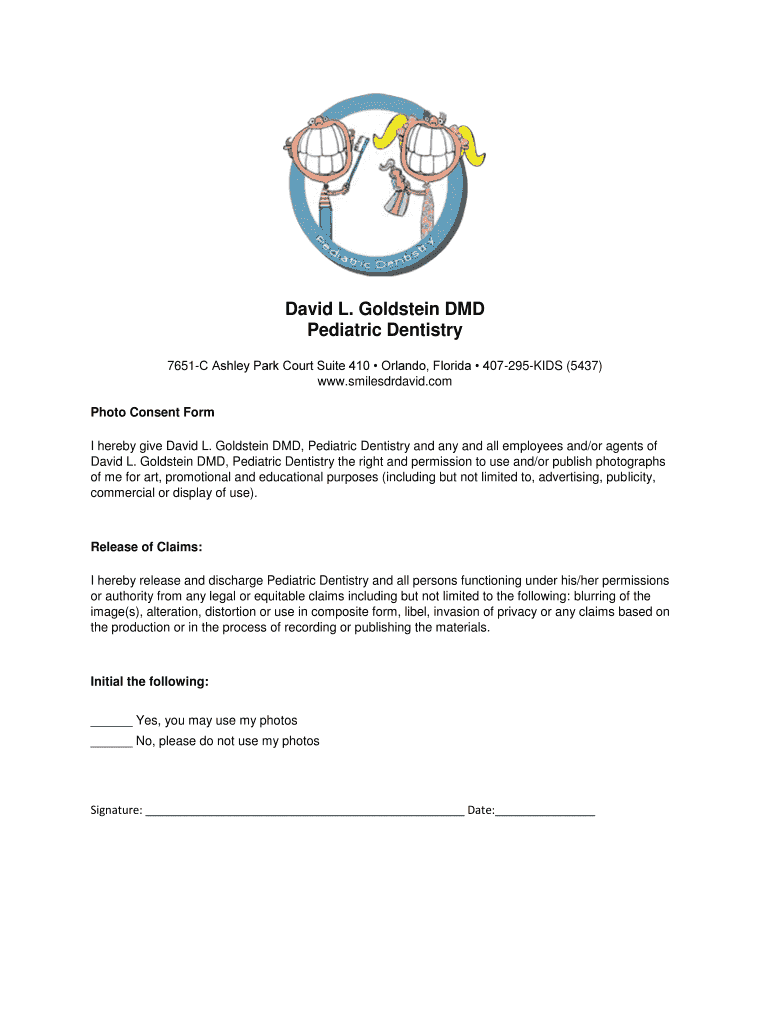 David L. Goldstein DMD Pediatric Dentistry 7651C Ashley Park Court Suite 410 Orlando, Florida 407295KIDS (5437) www.smilesdrdavid.com Photo Consent Form I hereby give David L. Goldstein DMD, Pediatric