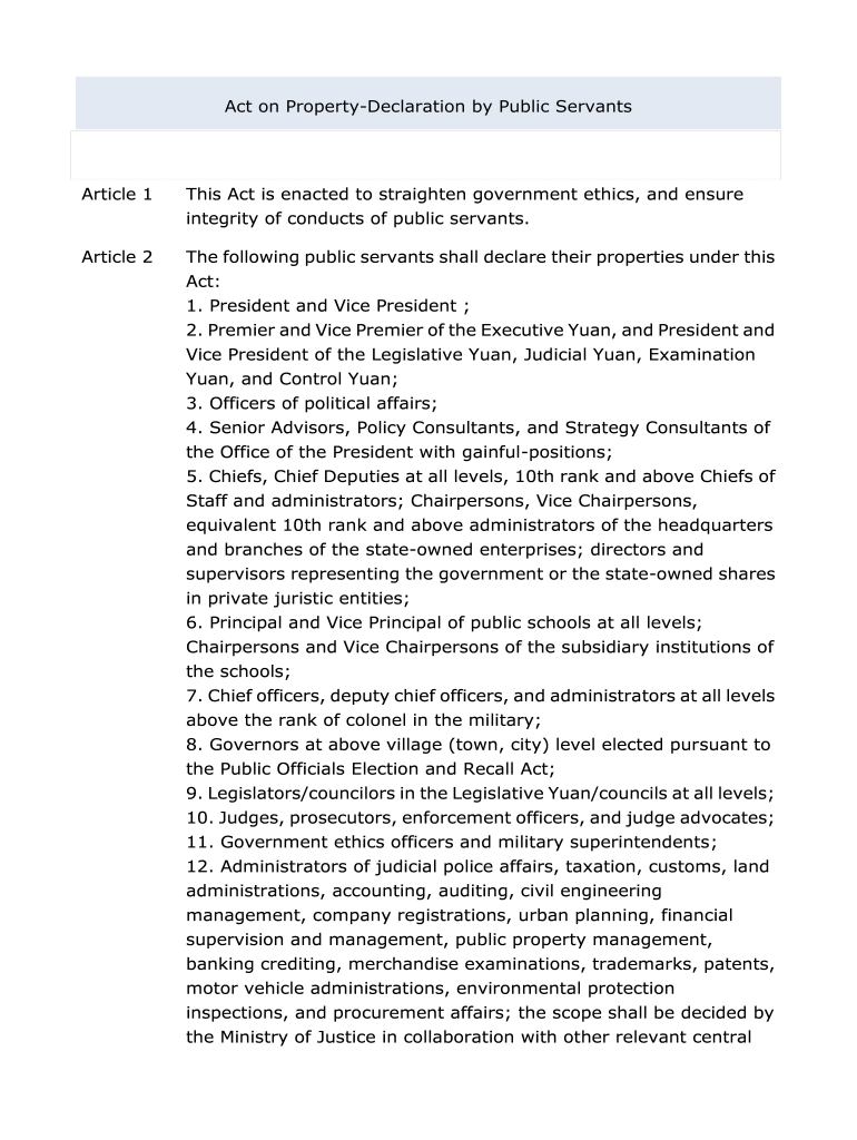 Act on PropertyDeclaration by Public ServantsArticle 1This Act is enacted to straighten government ethics, and ensure