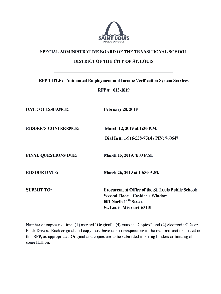 SPECIAL ADMINISTRATIVE BOARD OF THE TRANSITIONAL SCHOOL DISTRICT OF THE CITY OF ST. LOUIS RFP TITLE: Automated Employment and Income Verification System Services RFP #: 0151819DATE OF ISSUANCE:February