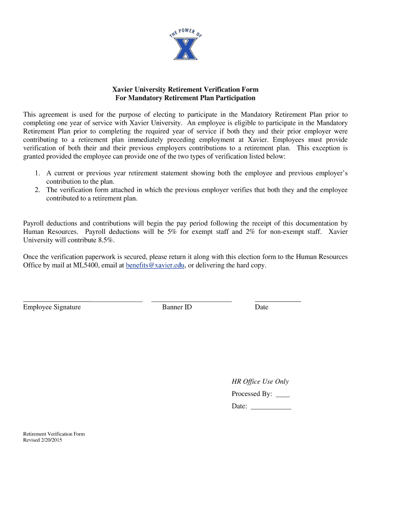 Get the free Xavier University Retirement Verification Form For ...