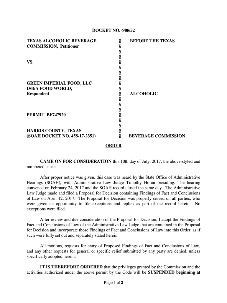 DOCKET NO. 640652 TEXAS ALCOHOLIC BEVERAGE COMMISSION, Petitioners. GREEN IMPERIAL FOOD, LLC D/B/A FOOD WORLD, RespondentPERMIT BF747920HARRIS COUNTY, TEXAS (SOAP DOCKET NO. 458172351) BEFORE THE