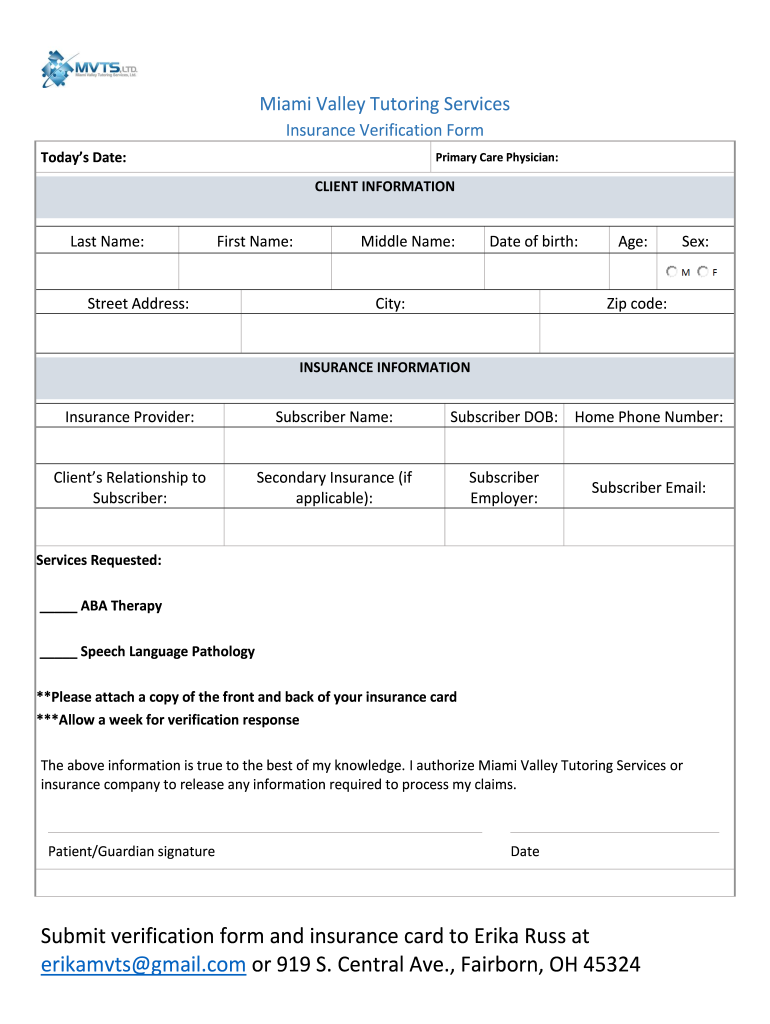 Miami Valley Tutoring Services Insurance Verification Form Today's Date:Primary Care Physician:CLIENT Informational Name:First Name:Street Address:Middle Name:Date of birth:City:Age:Sex:Zip code:INSURANCE