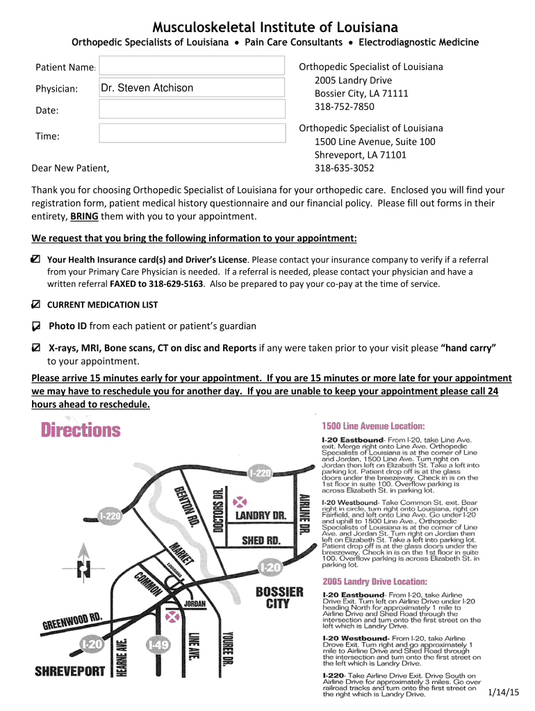 Musculoskeletal Institute of LouisianaOrthopedic Specialists of Louisiana Pain Care Consultants Electrodiagnostic MedicinePatient Name: Physician:Dr. Steven AtchisonDate: Time: Dear New Patient, Orthopedic