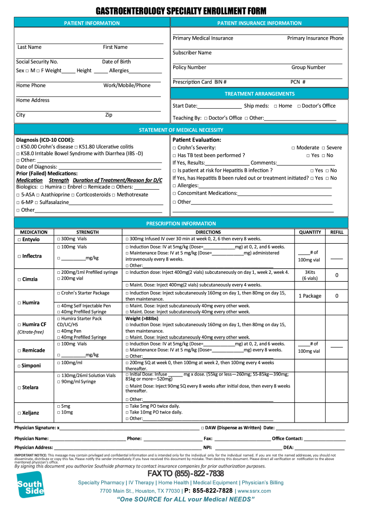 GASTROENTEROLOGY SPECIALTY ENROLLMENT FORM PATIENT INFORMATION Last Name First Name Social Security No. Date of Birth Sex M F Weight Height Allergies Home Phone Work/Mobile/Phone Home Address City