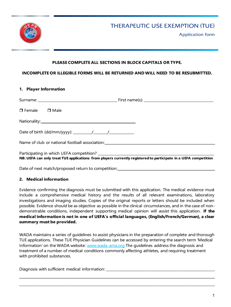 THERAPEUTIC USE EXEMPTION (TUE) Application formulas COMPLETE ALL SECTIONS IN BLOCK CAPITALS OR TYPE. INCOMPLETE OR ILLEGIBLE FORMS WILL BE RETURNED AND WILL NEED TO BE RESUBMITTED.1. Player Information