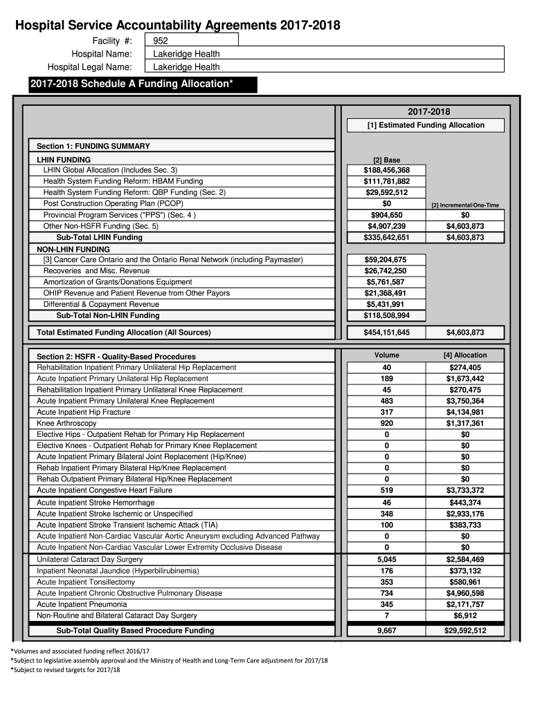 Hospital Service Accountability Agreements 20172018 Facility #: Hospital Name: Hospital Legal Name:952 Lake Ridge Health Lake Ridge Health20172018 Schedule A Funding Allocation* 20172018 1 Estimated