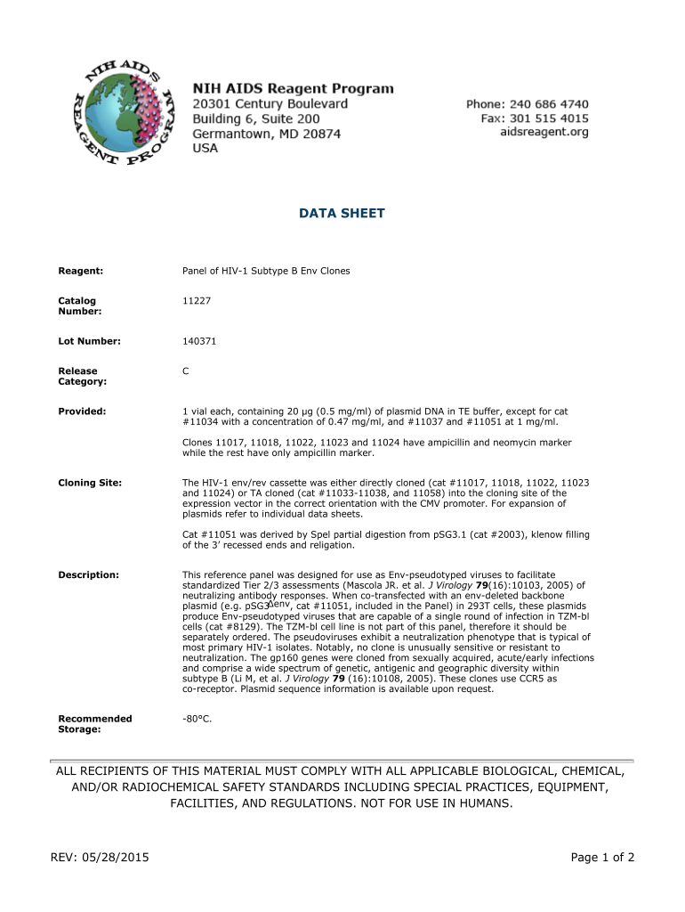 DATA SHEETReagent:Panel of HIV1 Subtype B Env ClonesCatalog Number:11227Lot Number:140371Release Category:Provided:1 vial each, containing 20 g (0.5 mg/ml) of plasmid DNA in TE buffer, except for