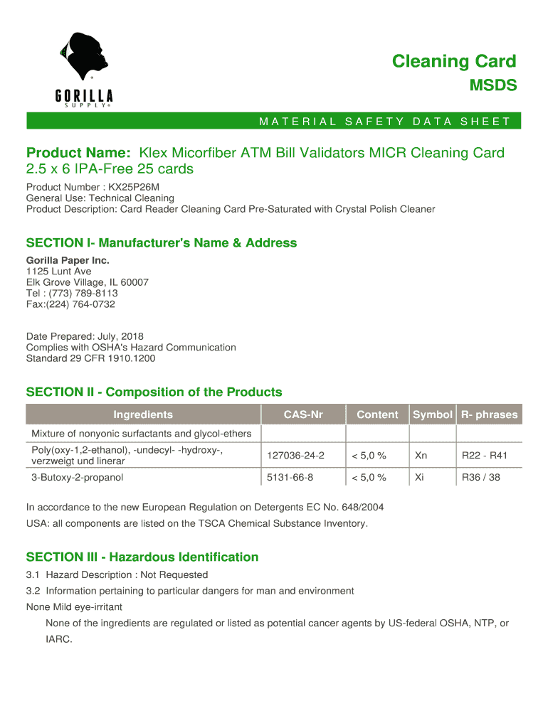 Cleaning Card MSDS MATERIAL SAFETY DATA SHEETProduct Name: Alex Microfiber ATM Bill Validators MICR Cleaning Card 2.5 × 6 Free 25 cards Product Number : KX25P26M General Use: Technical Cleaning Product