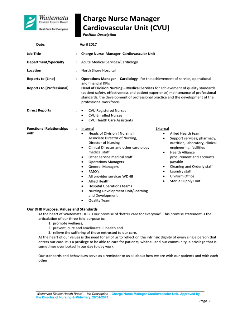 Charge Nurse Manager Cardiovascular Unit (CVU) Position Description Date:April 2017Job Title:Charge Nurse Manager Cardiovascular UnitDepartment/Specialty:Acute Medical Services/CardiologyLocation:North