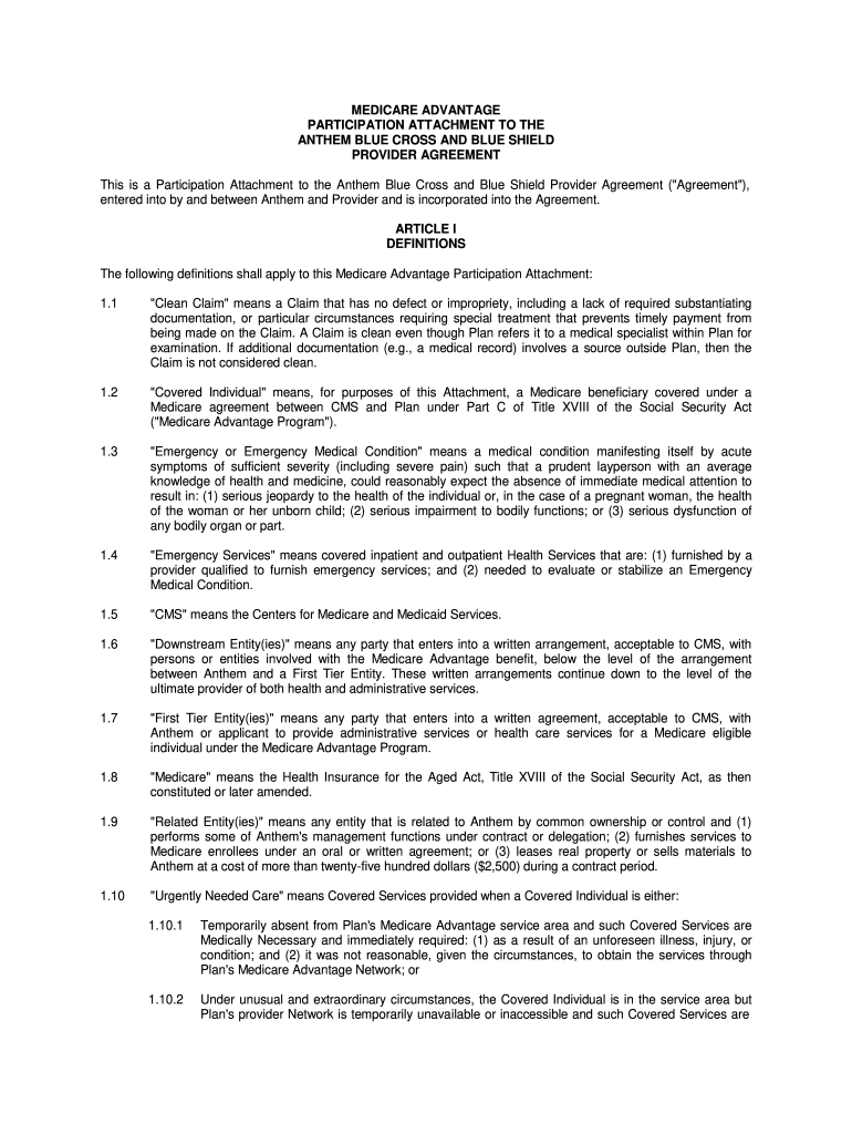 MEDICARE ADVANTAGE PARTICIPATION ATTACHMENT TO THE ANTHEM BLUE CROSS AND BLUE SHIELD PROVIDER AGREEMENT This is a Participation Attachment to the Anthem Blue Cross and Blue Shield Provider Agreement