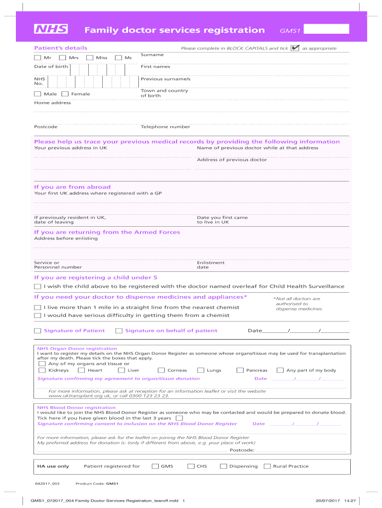 Patients detailsGMS1Please complete in BLOCK CAPITALS and ticks appropriateSurname