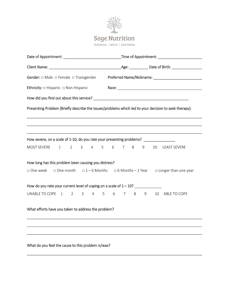 Date of Appointment:Time of Appointment:Client Name:Age:Date of Birth:Gender: Male Female TransgenderPreferred Name/Nickname:Ethnicity: Hispanic NonHispanicRace:How did you find out about this service?
