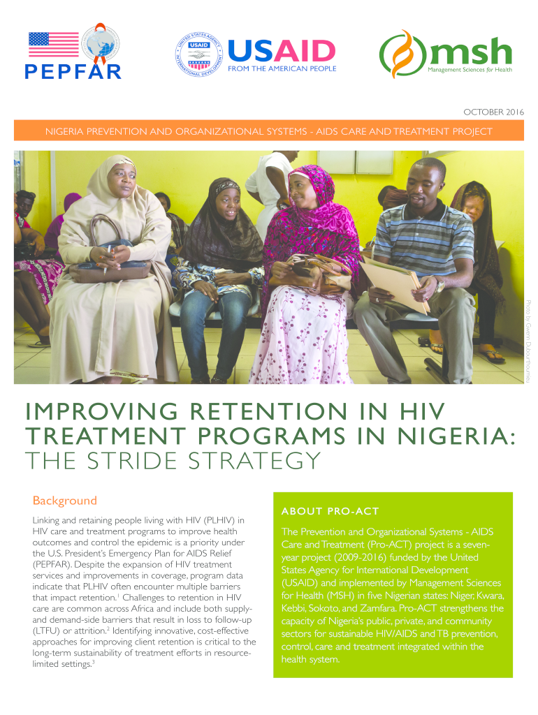 OCTOBER 2016NIGERIA PREVENTION AND ORGANIZATIONAL SYSTEMS AIDS CARE AND TREATMENT PROJECTPhoto by Glenn DubourthoumieuIMPROVING RETENTION IN HIV TREATMENT PROGRAMS IN NIGERIA: THE STRIDE STRATEGY