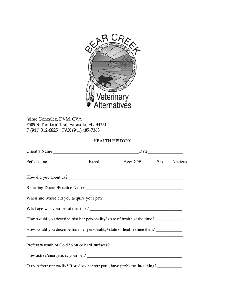 Jaime Gonzalez, DVM, CVA 7509 S. Tamiami Trail Sarasota, FL. 34231 P (941) 3126825 FAX (941) 4877363 HEALTH HISTORY Clients Name Date Pets Name Breed Age/DOB Sex Neutered How did you about us? Referring