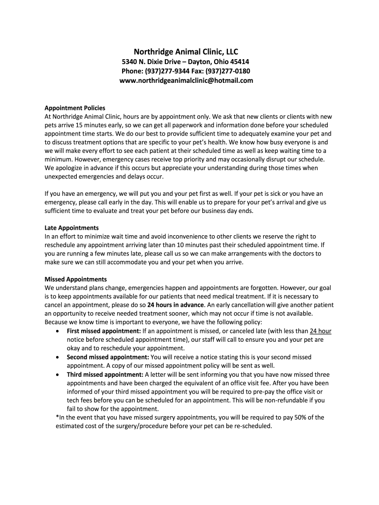 Northridge Animal Clinic, LLC 5340 N. Dixie Drive Dayton, Ohio 45414 Phone: (937)2779344 Fax: (937)2770180 www.northridgeanimalclinic Hotmail. Appointment Policies At Northridge Animal Clinic, hours