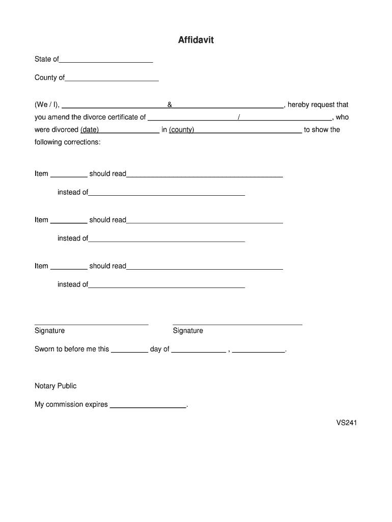 Affidavit State of County of (We / I), &, hereby request that you amend the divorce certificate of were divorced (date) /, who in (county) to show the following corrections: Item should read instead
