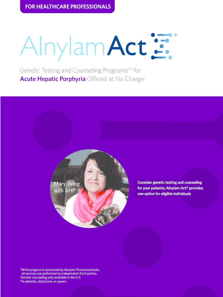 FOR HEALTHCARE PROFESSIONALSGenetic Testing and Counseling Programs* for Acute Hepatic Porphyria Offered at No Charge Mary, living with HP×While program is sponsored by Alnilam Pharmaceuticals, all