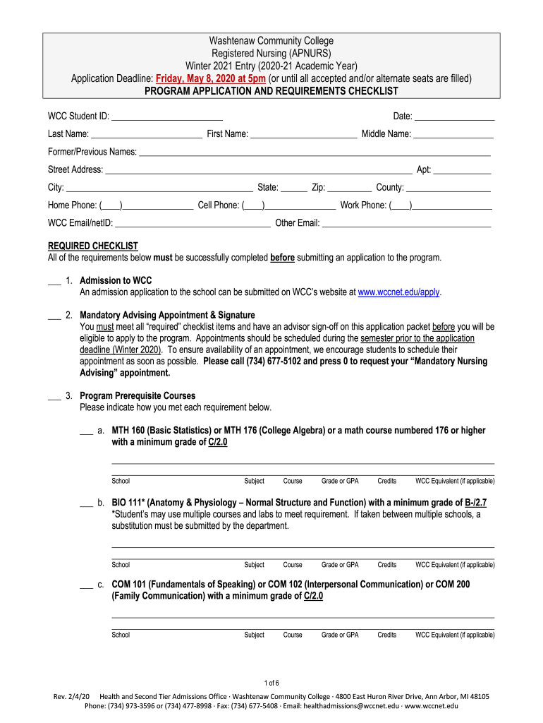 Washtenaw Community College Registered Nursing (APN URS) Winter 2021 Entry (202021 Academic Year) Application Deadline: Friday, May 8, 2020, at 5pm (or until all accepted and/or alternate seats are