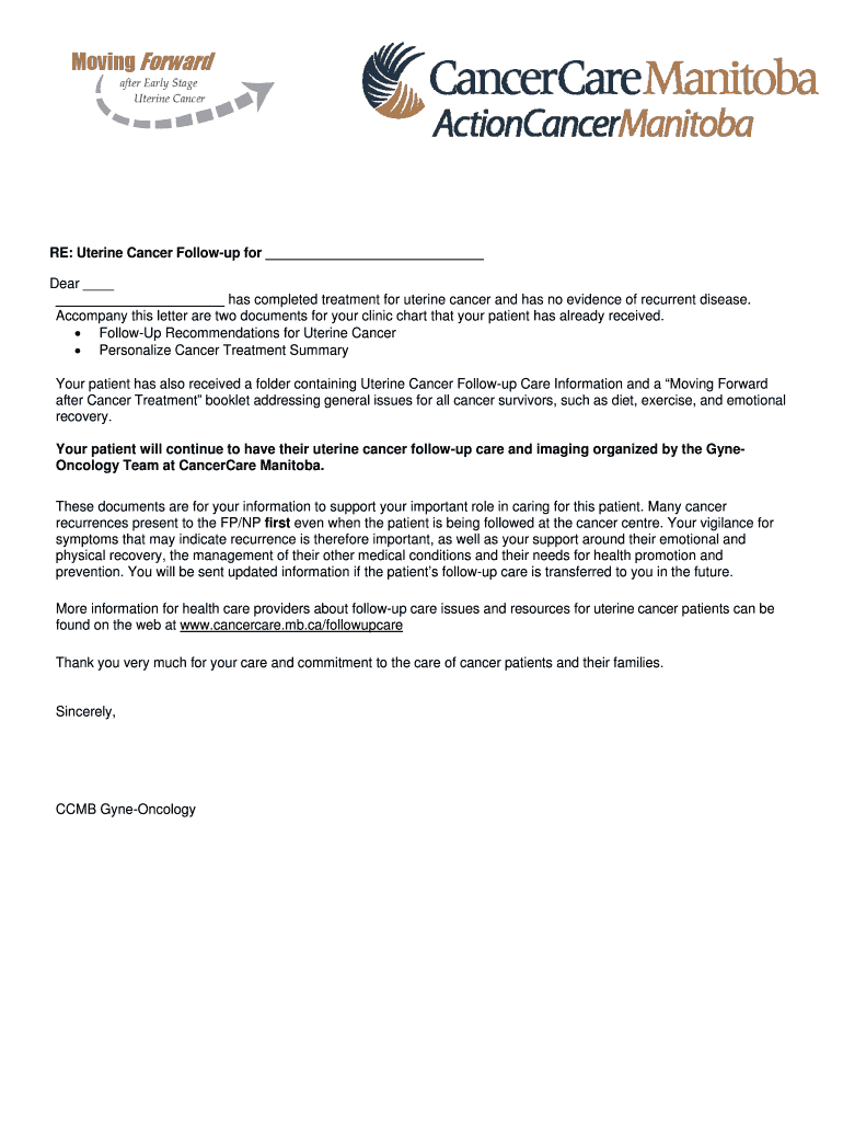 RE: Uterine Cancer Followup for Dear has completed treatment for uterine cancer and has no evidence of recurrent disease. Accompany this letter are two documents for your clinic chart that your patient