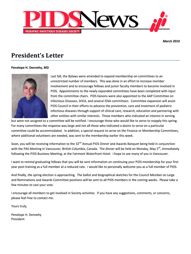 March2010 PresidentsLetter Penelope. Kennedy, MD Last fall, theBylawswereamendedtoexpandmembershiponcommitteestoan unrestrictednumberofmembers. Thiswasdoneinanefforttoincreasemember involvementandtoencouragefellowsandjuniorfacultymemberstobecomeinvolvedin