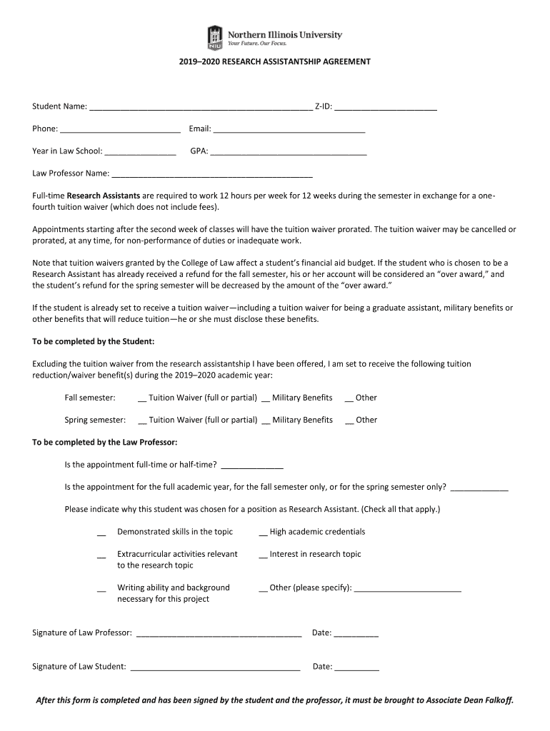 Students who are employed as research assistants during the 2019-2020 academic year are required to file the 20192020 research assistantship agreement.