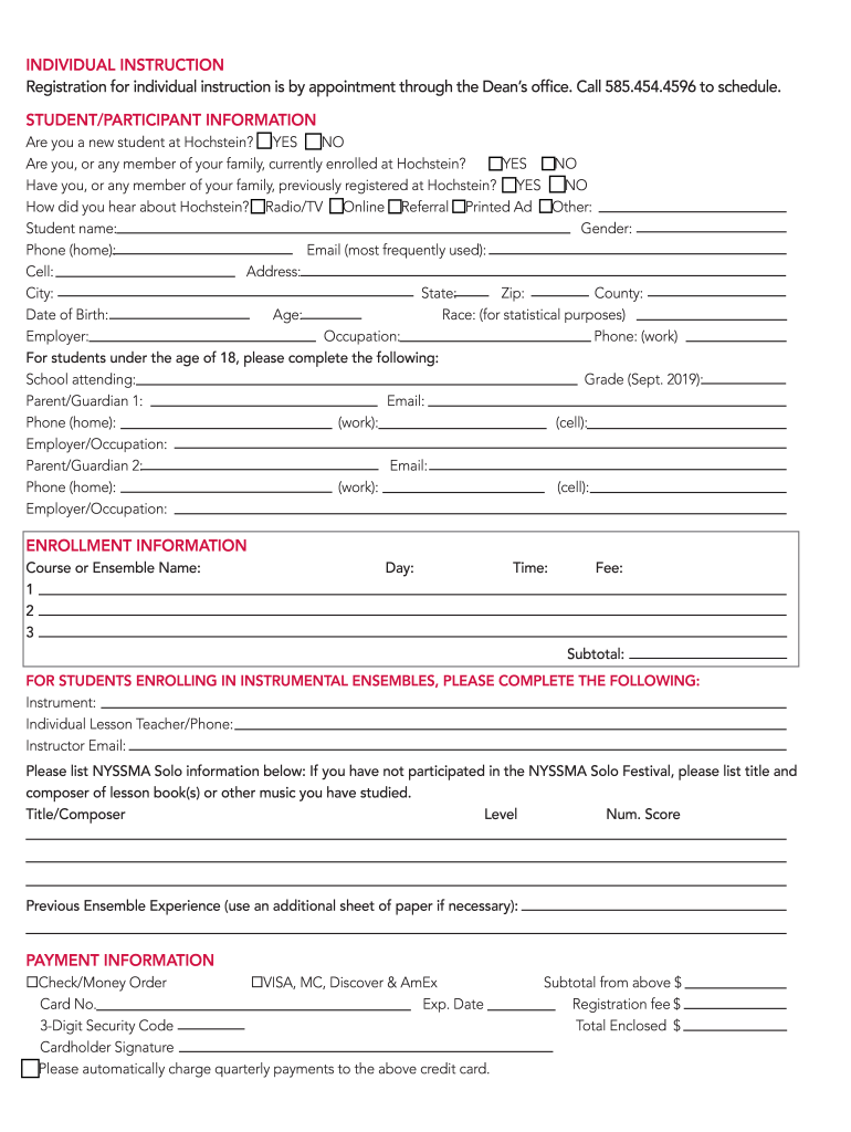 Registration for individual instruction is by appointment through the Deans office. Call 585.454.4596 to schedule.