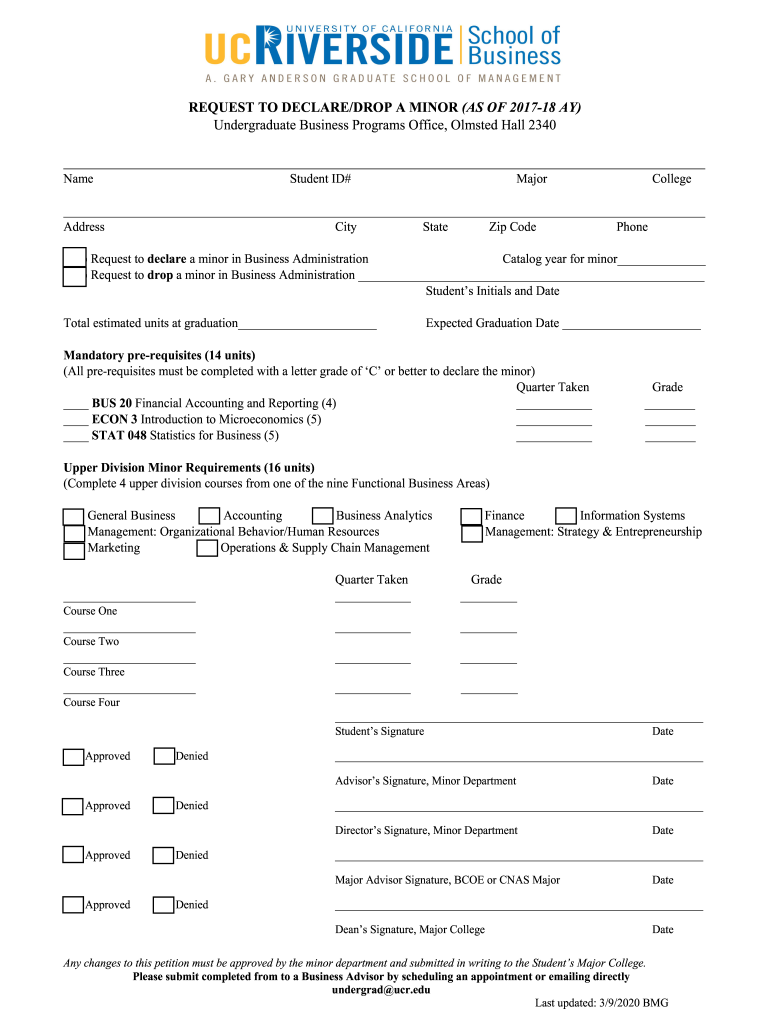 REQUEST TO DECLARE/DROP A MINOR (AS OF 201718 A) Undergraduate Business Programs Office, Olmsted Hall 2340 NameStudent ID#MajorCollege Address City State Zip Code Phone (() Request to declare a minor