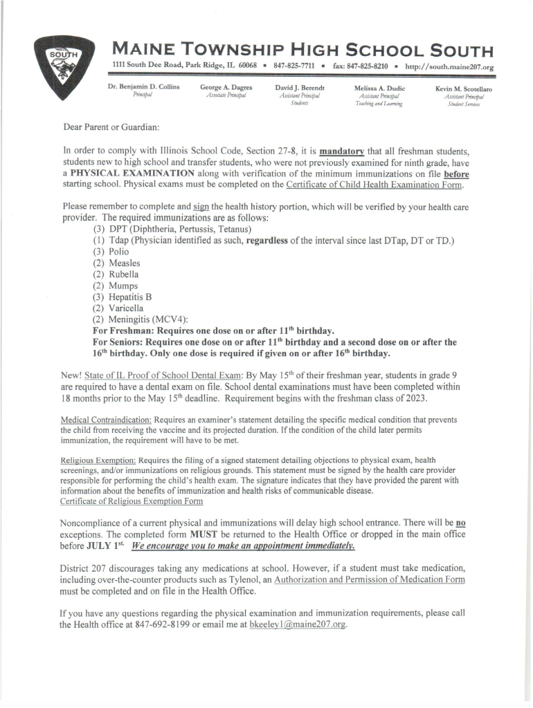 MAINE TOWNSHIP HIGH SCHOOL SOUTH 1111 South Dee Road, Park Ridge, IL 60068 Dr. Benjamin D. Collins Principal George A. Dares Associate Principal8478257711 fax: 8478258210 http://south.maine207.orgDavid