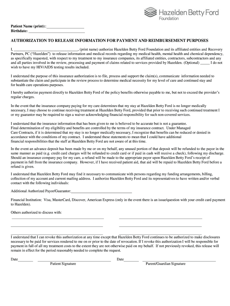 Patient Name (print):: Birthdate:AUTHORIZATION TO RELEASE INFORMATION FOR PAYMENT AND REIMBURSEMENT PURPOSES I, (print name) authorize Hazel den Betty Ford Foundation and its affiliated entities and