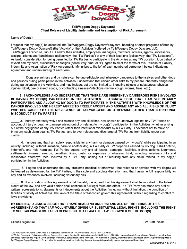 Get the free Doggie Daycare Liability Waiver and Application - My Three Dogs