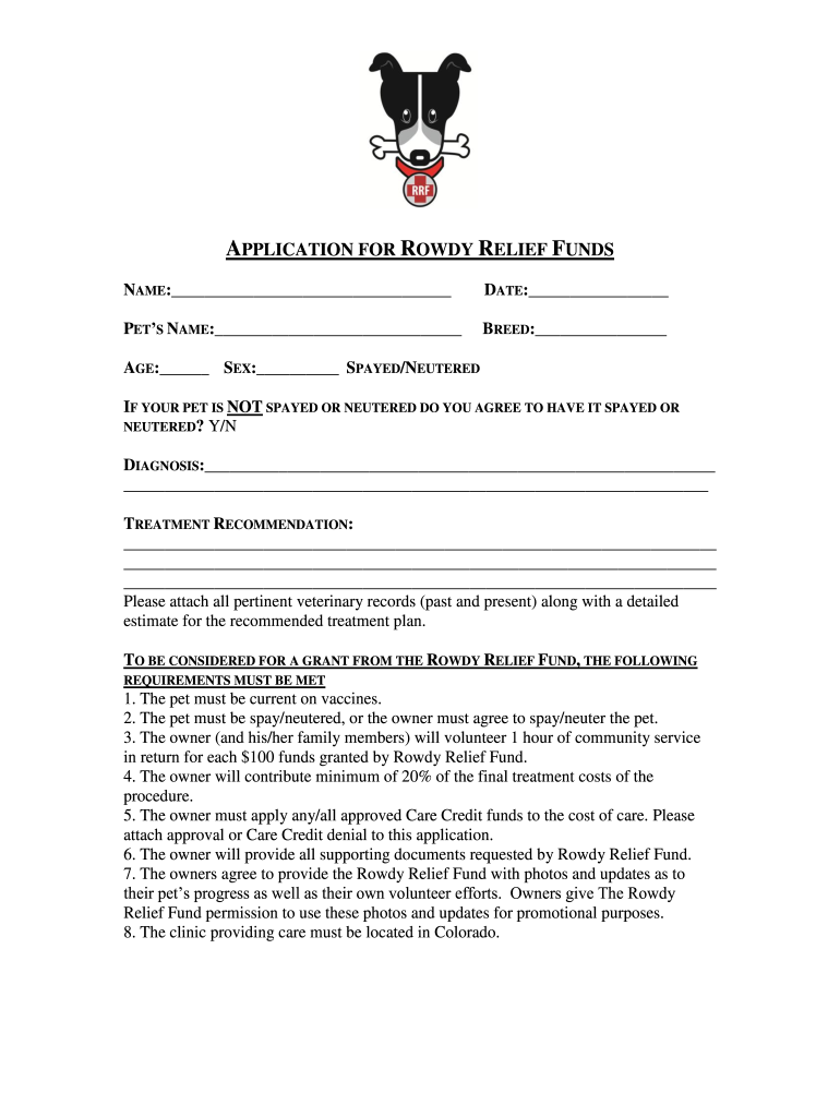 APPLICATION FOR ROWDY RELIEF FUNDS NAME: DATE: PETS NAME: BREED: AGE: SEX: SPAYED/NEUTERED IF YOUR PET IS NOT SPAYED OR NEUTERED DO YOU AGREE TO HAVE IT SPAYED OR NEUTERED? Y/N DIAGNOSIS: TREATMENT