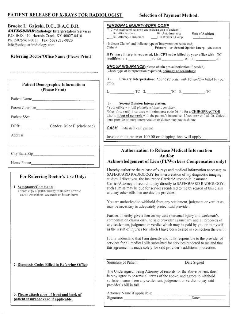PATIENT RELEASE OF RAYS FOFiRADIOLOGISTBrooke L. Games, D.C., D.A.C.B.R. SAFE AWARD Radiology Interpretation Services P.O. BOX 410, Harrods Creek, KY 400270410 pH. (502)961001 Fax (502) 21308201info