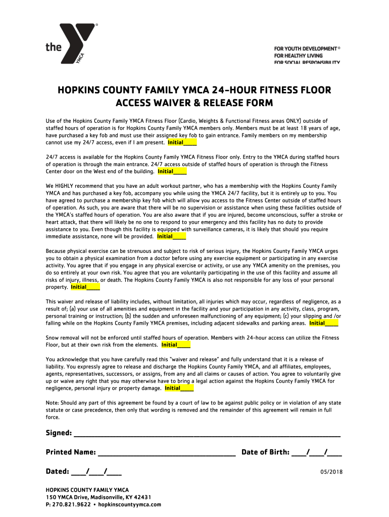 HOPKINS COUNTY FAMILY YMCA 24HOUR FITNESS FLOOR ACCESS WAIVER & RELEASE FORM Use of the Hopkins County Family YMCA Fitness Floor (Cardio, Weights & Functional Fitness areas ONLY) outside staffed hours