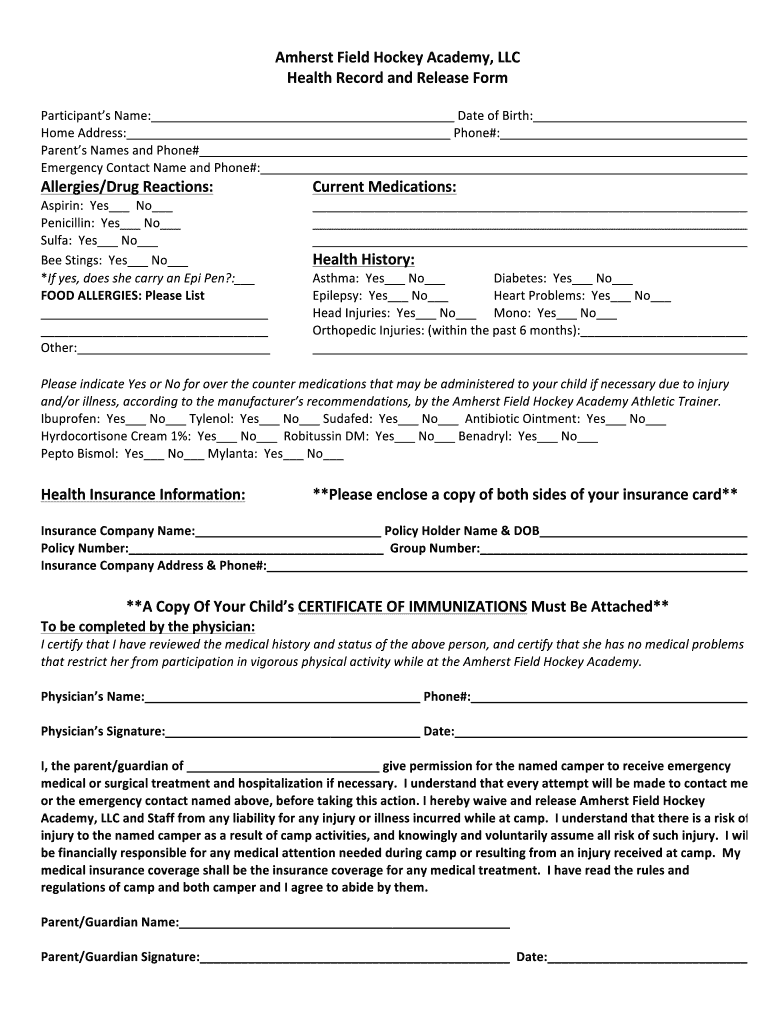 AmherstFieldHockeyAcademy, LLC HealthRecordandReleaseFormParticipantsName: DateofBirth: Headdress: Phone#: ParentsNamesandPhone# EmergencyContactNameandPhone#: Allergies/DrugReactions:Aspirin:Yes