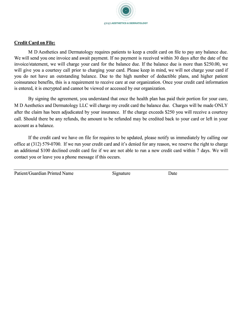 M D Aesthetics and Dermatology requires patients to keep a credit card on LE to pay any balance due.