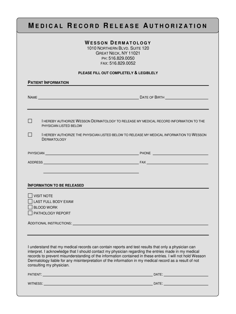 MEDICAL RECORD RELEASE AUTHORIZATION WESSON DERMATOLOGY 1010 NORTHERN BLVD. SUITE 120 GREAT NECK, NY 11021 PH: 516.829.0050 FAX: 516.829.0052 PLEASE FILL OUT COMPLETELY & LEGIBLELYPATIENT INFORMATIONNAMEDATE