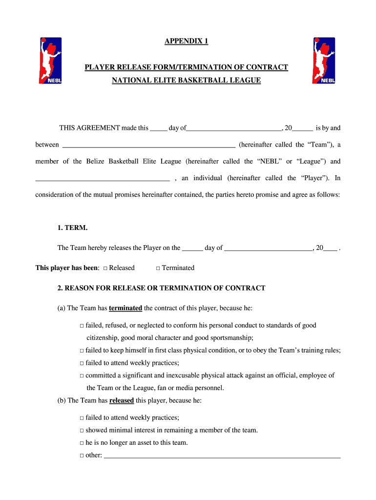 APPENDIX 1PLAYER RELEASE FORM/TERMINATION OF CONTRACT NATIONAL ELITE BASKETBALL LEAGUES AGREEMENT made this day of, 20 is by and between (hereinafter called the Team), a member of the Belize Basketball
