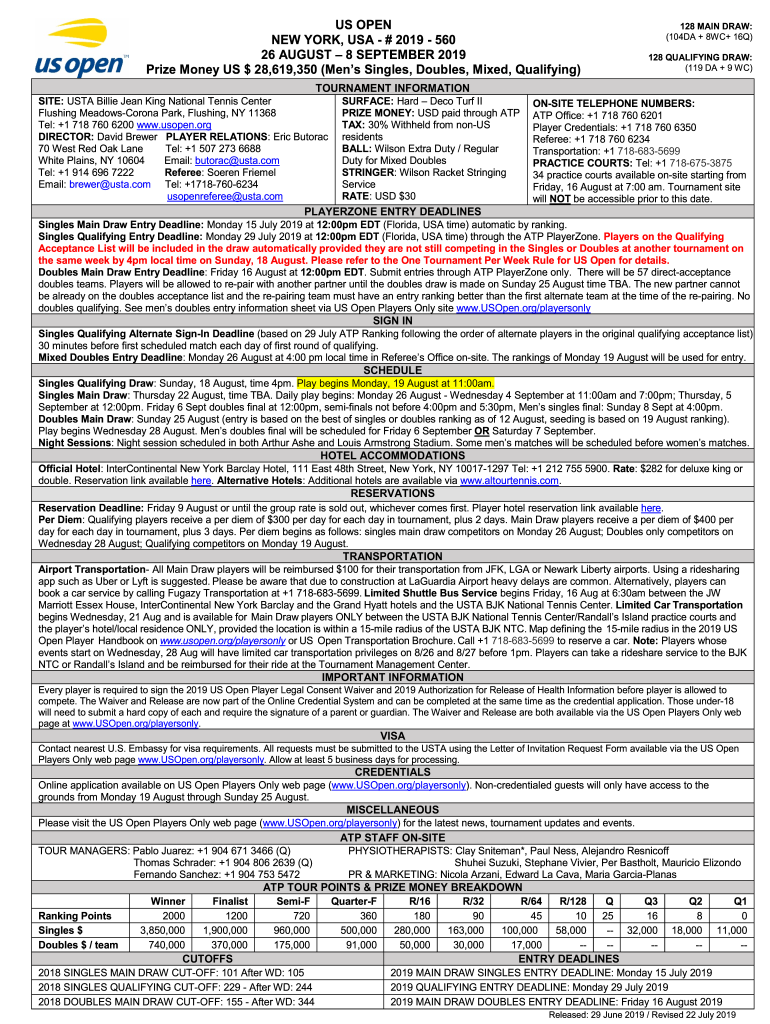 US OPEN NEW YORK, USA # 2019 560 26 AUGUST 8 SEPTEMBER 2019 Prize Money US $28,619,350 (Men Singles, Doubles, Mixed, Qualifying)128 MAIN DRAW: (104DA + 8WC+ 16Q) 128 QUALIFYING DRAW: (119 DA + 9 WC)TOURNAMENT