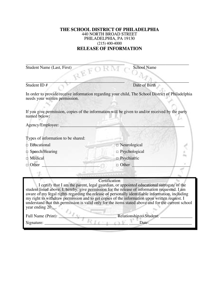 THE SCHOOL DISTRICT OF PHILADELPHIA 440 NORTH BROAD STREET PHILADELPHIA, PA 19130 (215) 4004000RELEASE OF INFORMATION Student Name (Last, First) School Name Student ID # Date of Birthing order to