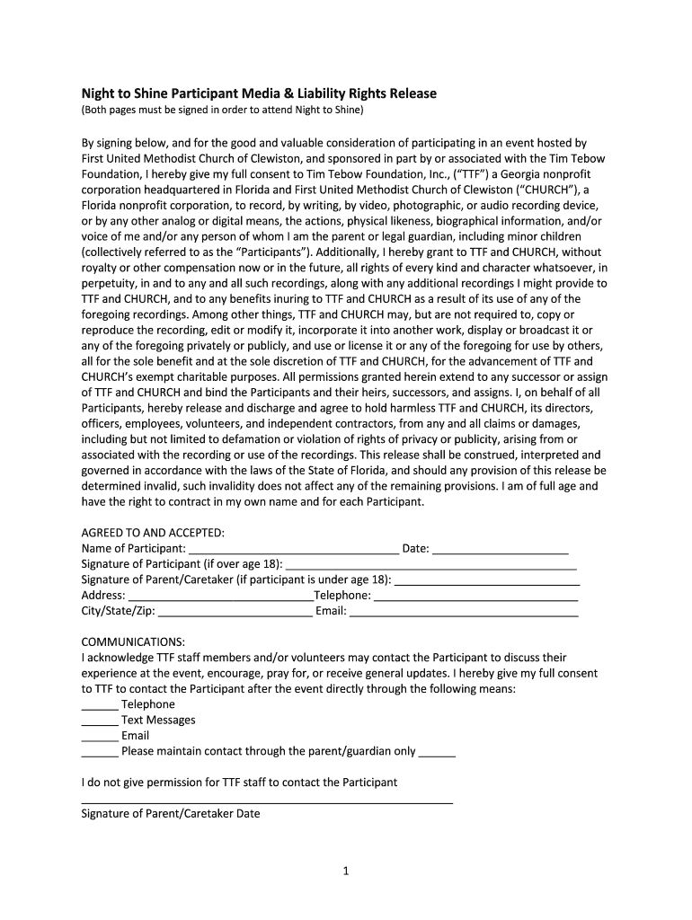 Night to Shine Participant Media & Liability Rights Release (Both pages must be signed in order to attend Night to Shine)By signing below, and for the good and valuable consideration of participating