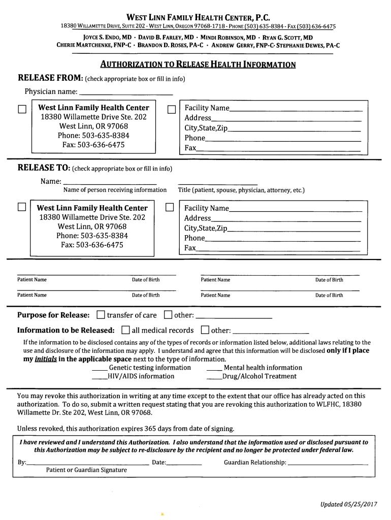 WEST LINN FAMILY HEALTH CENTER, P.C. 18380 WILLAMETTE DRIVE, SUITE 202 WEST LINN, OREGON 970681718 PHONE (503) 6358384 FAX (503) 6366475 JOYCE S. END, MD DAVID B. FARLEY, MD MIND ROBINSON, MD RYAN