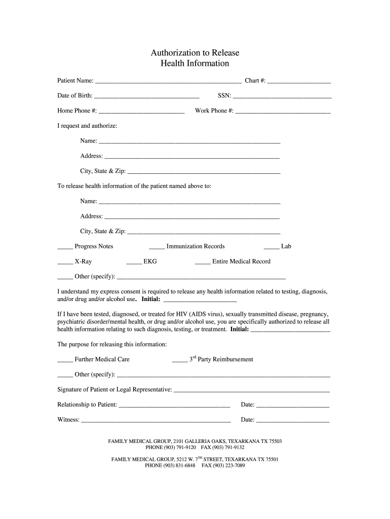 Authorization to Release Health Information Patient Name: Chart #: Date of Birth: Home Phone #: SSN: Work Phone #: I request and authorize: Name: Address: City, State & Zip: To release health information