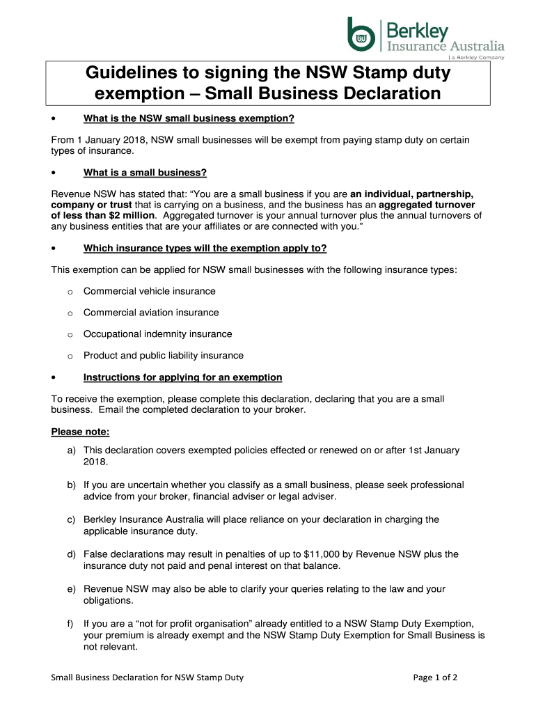 Guidelines to signing the NSW Stamp duty exemption Small Business Declaration What is the NSW small business exemption? From 1 January 2018, NSW small businesses will be exempt from paying stamp duty